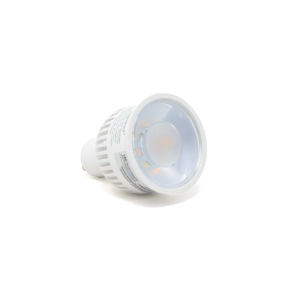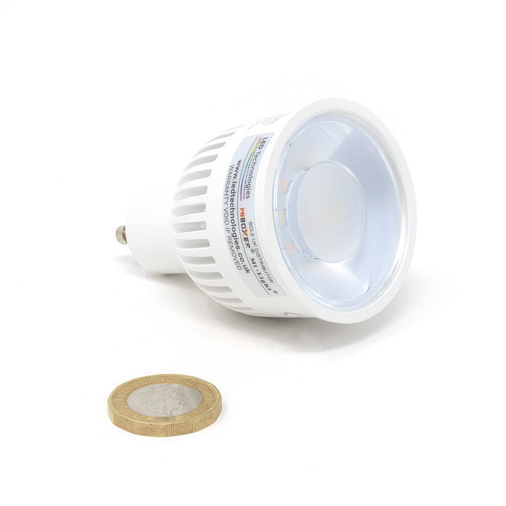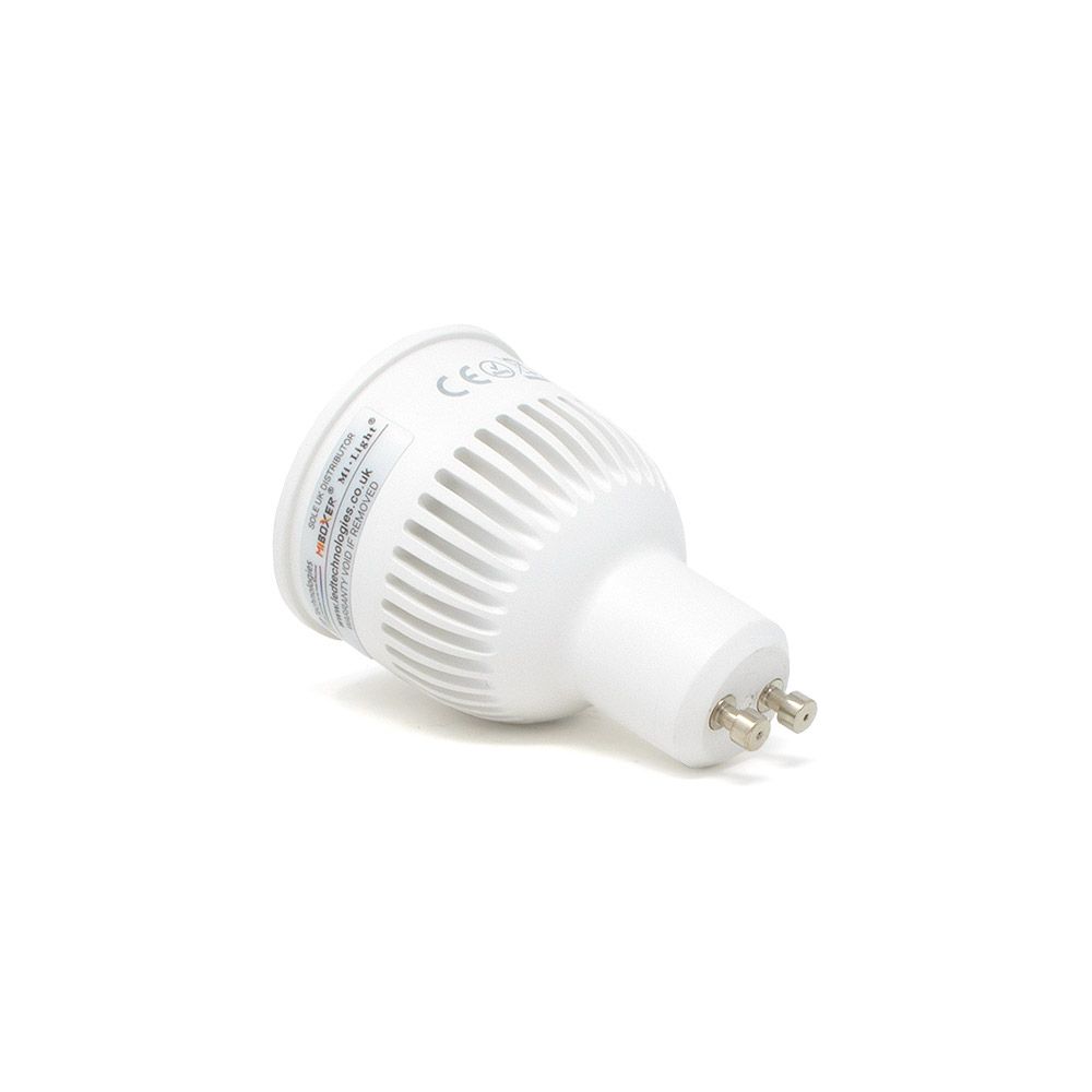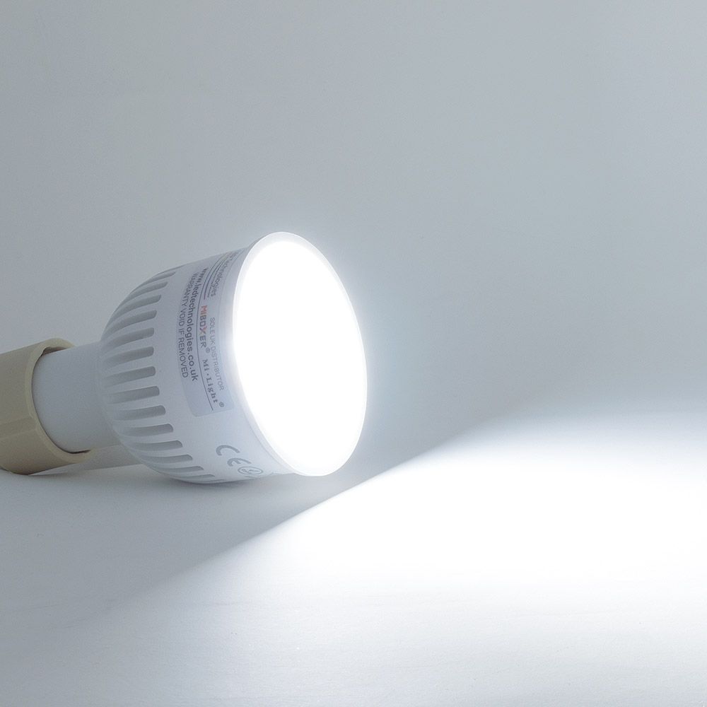 This modern LED GU10 Spotlight has a very bright light output of 6 Watts (550LM). One of the most impressive features of this Mi-Light MiBoxer LED Bulb is that it is a direct replacement for a standard GU10 light bulb. With the same diameter of 50mm as the halogen equivalent, this enables it to fit into a standard GU10 housing (see note below).